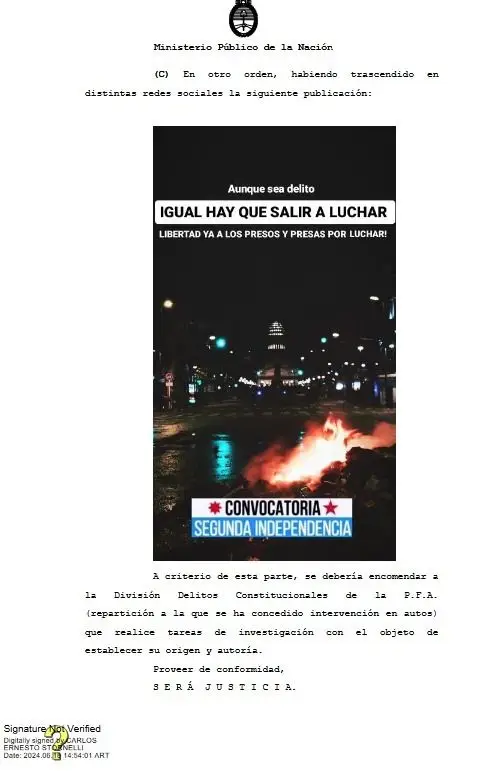 En otro orden, se refirió a las convocatoria en distintas redes sociales en las que se pedía por la liberación de los detenidos bajo consignas como “aunque sea delito hay que salir a luchar “; “libertad a los presos y presas por luchar”; y planteó que “se debería encomendar a la División Delitos Constitucionales de la P.F.A. (repartición a la que se ha concedido intervención en autos) que realice tareas de investigación con el objeto de establecer su origen y autoría”.