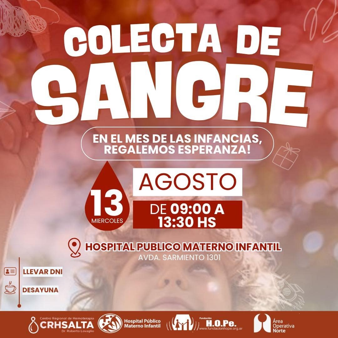 HOPe te invita a sumarte a la cadena de vida donando sangre este miércoles 13 de agosto de 9 a 13:30, en el Hospital Materno Infantil, sito en Avda. Sarmiento 1301.
