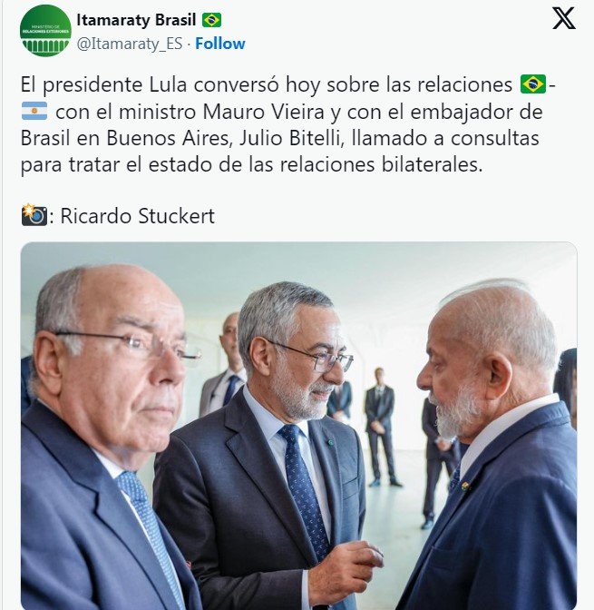 Se trata de Julio Bitelli. La cancillería brasileña pretende reflexionar sobre el futuro de la relación bilateral. Llega después de que Milei haya ido -en un viaje relámpago- al balneario Camboriú para decir que Bolsonaro es un «político perseguido».