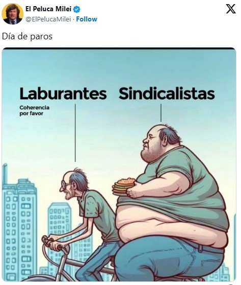 Por su parte, Milei publicó en su cuenta de la red social X una imagen irónica con el presunto rol de un trabajador y un sindicalista, en el que un hombre flaco maneja una bicicleta llevando a otro obeso que viaja comiendo una hamburguesa.