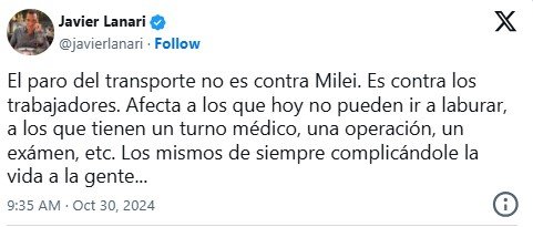 El Presidente también compartió un mensaje del subsecretario de Prensa, Javier Lanari, quien remarcó que «el paro del transporte no es contra Milei» sino que «es contra los trabajadores». «Afecta a los que hoy no pueden ir a laburar, a los que tienen un turno médico, una operación, un exámen, etc. Los mismos de siempre complicándole la vida a la gente», dice el mensaje de Lanari.