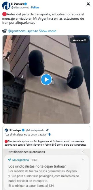 Estos mensajes contra el derecho a huelga de los transportistas por parte de las principales figuras del Gobierno nacional se suman a los que comenzaron a circular desde ayer en altoparlantes de las estaciones de trenes y a través de la aplicación Mi Argentina, donde se apunta a los sindicalistas Pablo Moyano (Camioneros) y Pablo Biró (Pilotos) por «no dejar» trabajar a los ciudadanos.