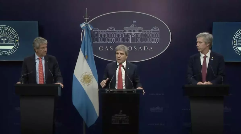23/05/2025.- www.eldiarioar.com.- Foto portada: Luis Caputo, este jueves frente al equipo económico que lanzó un plan para regularizar los dólares «bajo el colchón». Imagen: