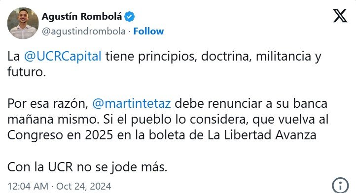 Uno de esos legisladores que estuvo en Evolución en 2021, que ahora no rompió y verá vencer su mandato en 2025 es Martín Tetaz. El diputado fue duramente cuestionado por Agustín Rombolá, ex presidente de la Juventud Radical de la CABA y pidió su renuncia a la banca por no cumplir con la promesa electoral, por lo que lo invitó a ser candidato del PRO o de La Libertad Avanza y no de la UCR.