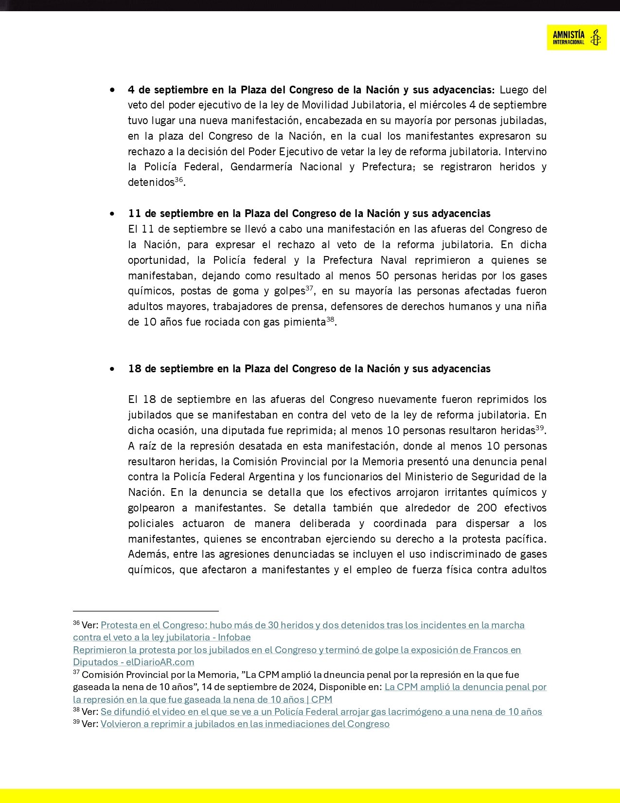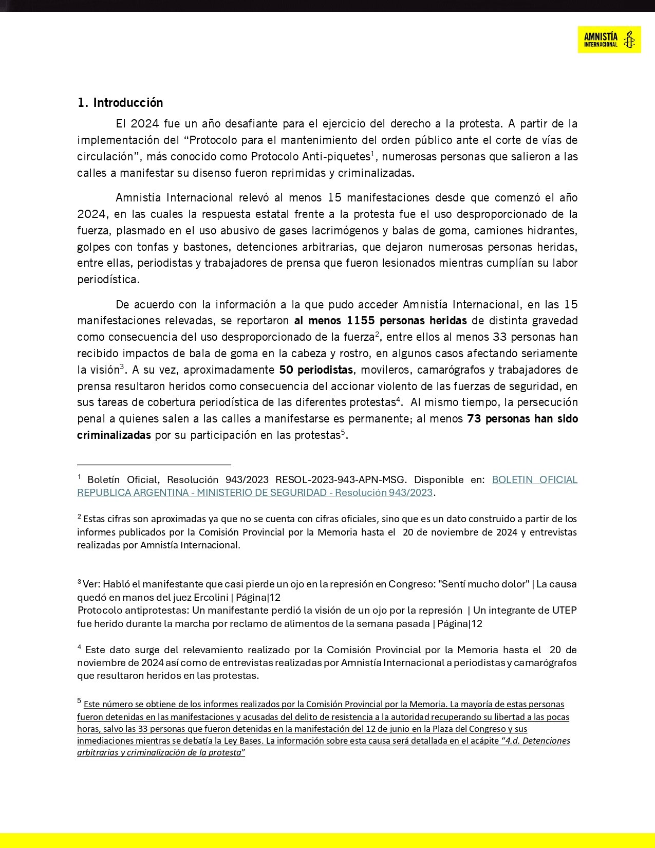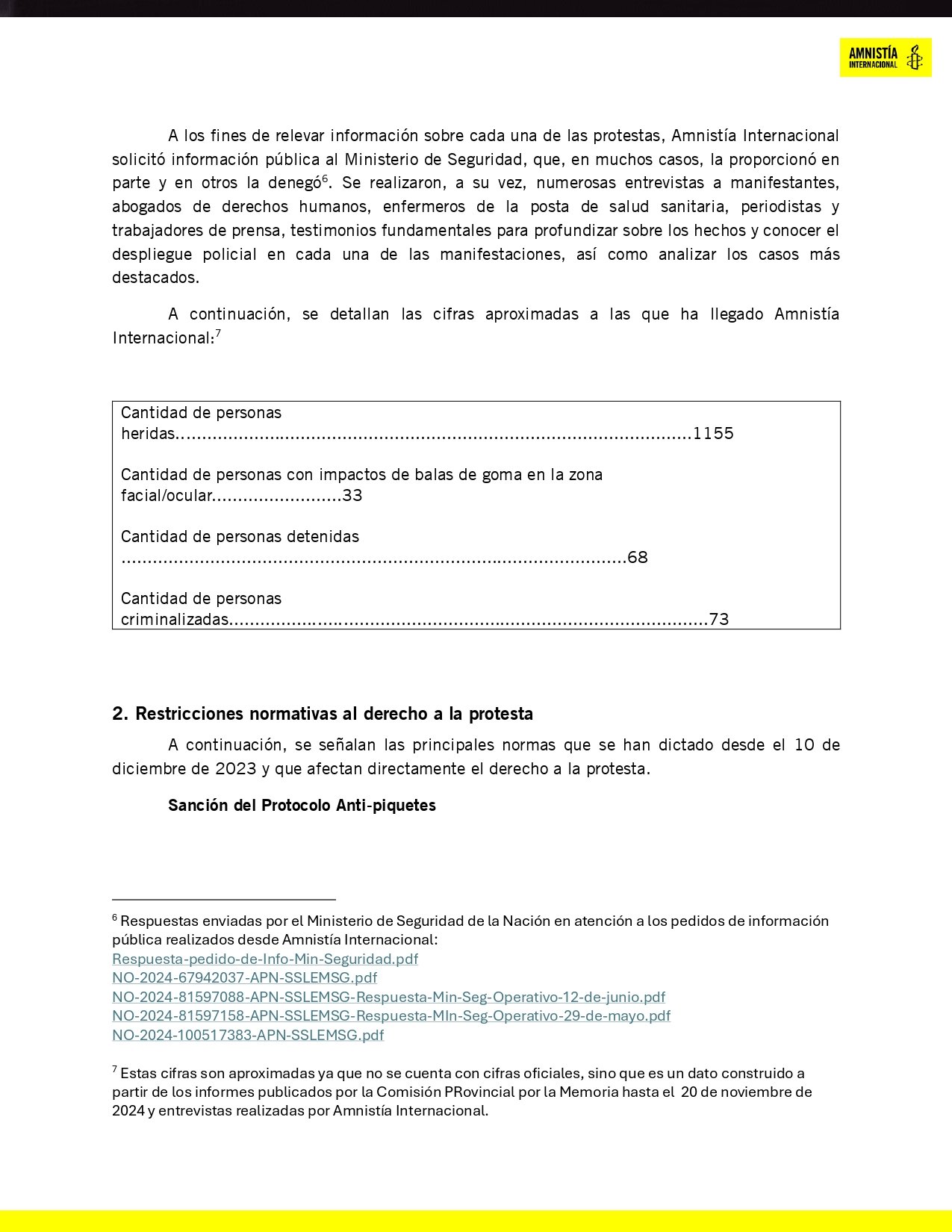 Amnistía relevó 15 protestas reprimidas entre enero y septiembre de 2024. Estos eventos dejaron 1.155 personas heridas, de las cuales 33 sufrieron impactos de balas de goma en la cabeza o el rostro, algunas perdiendo parcial o totalmente la visión. Entre los afectados se contaron 50 periodistas que intentaban documentar los hechos y sufrieron agresiones mientras cumplían su labor.