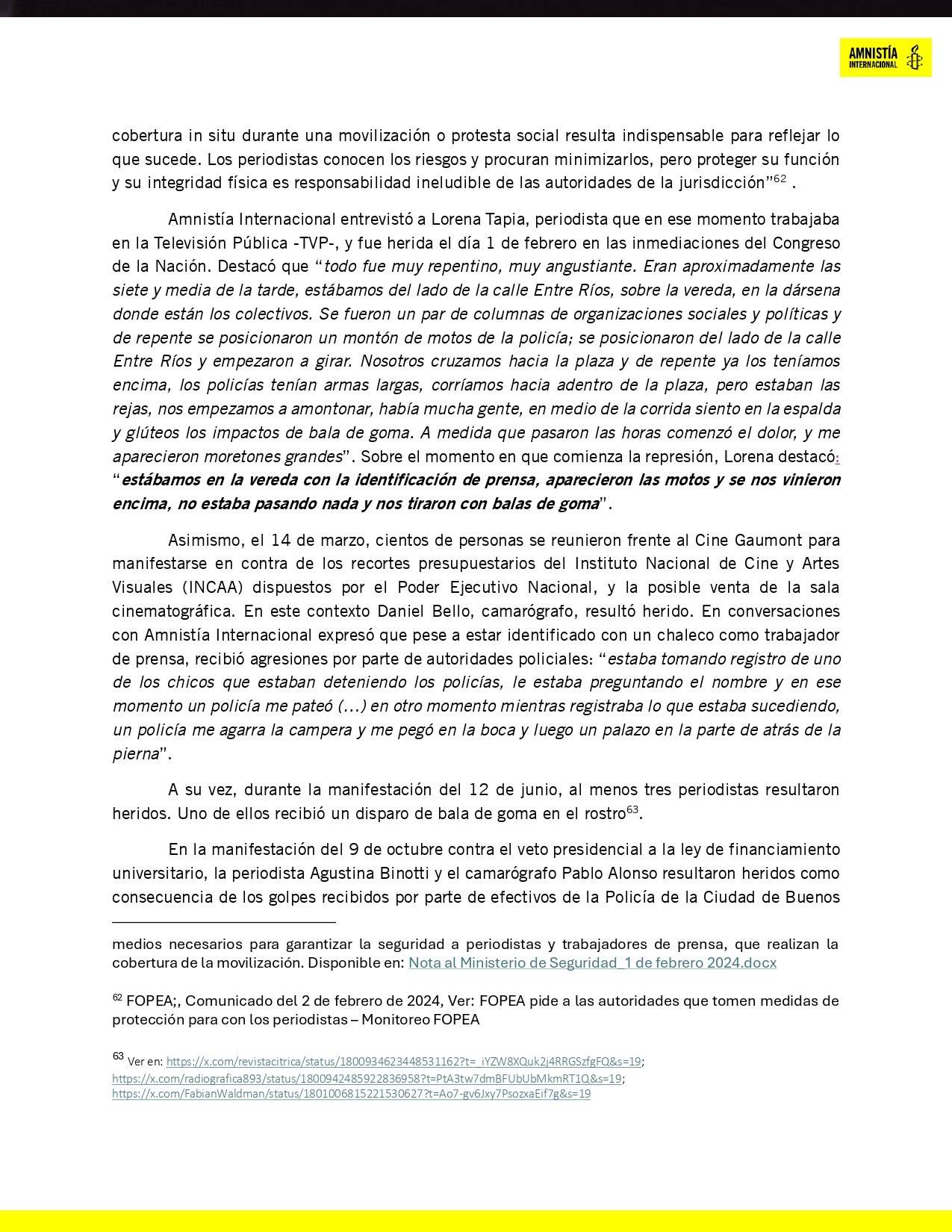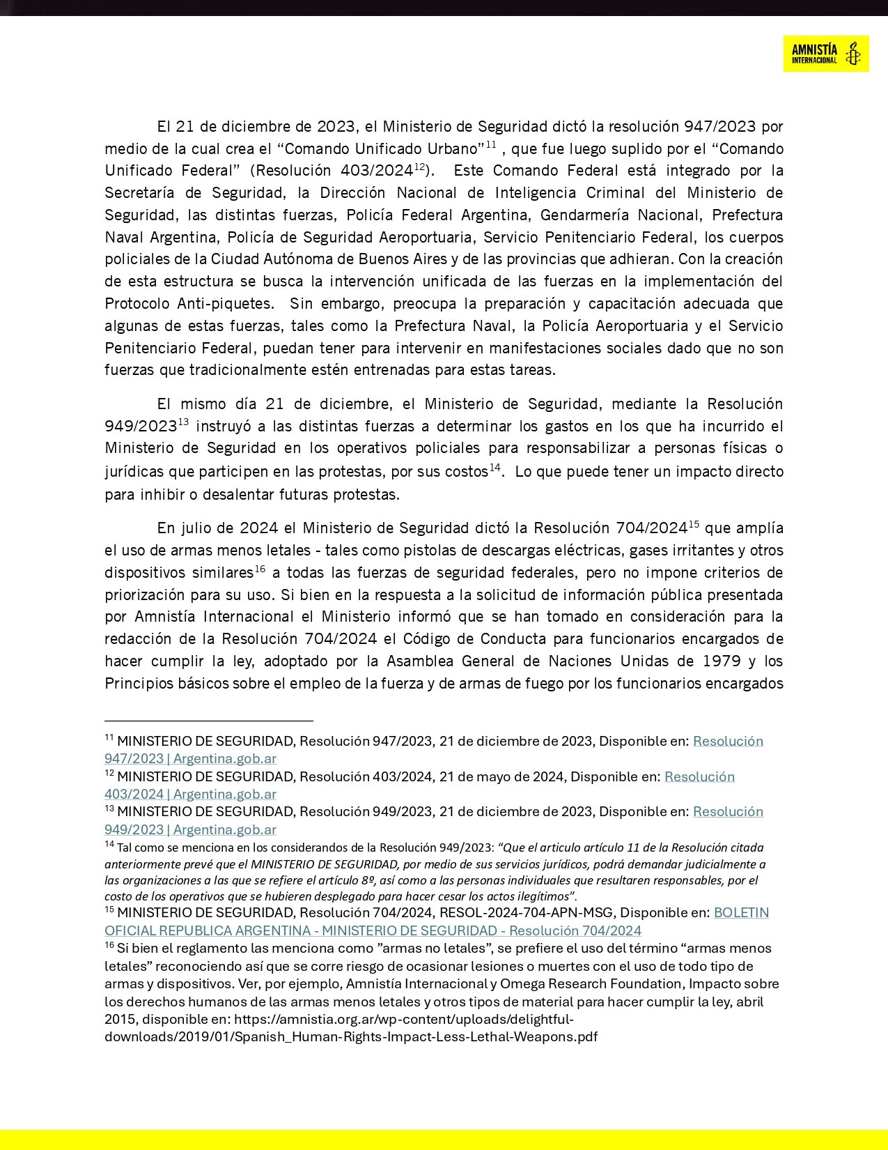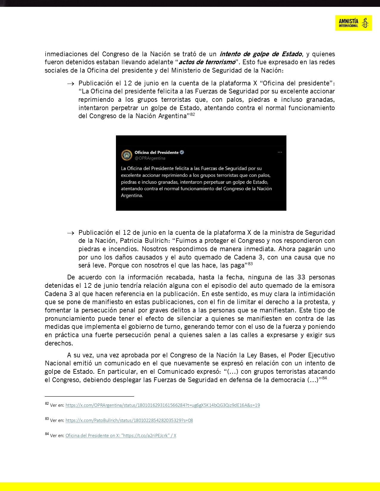 Amnistía Internacional salió a responderle a Bullrich, con un posteo en X (Twitter): “Sí, entendemos. Entendemos que los gobiernos se enojen con nuestro trabajo. De hecho, entre los países que desacreditan nuestros informes sobre el uso abusivo de la fuerza, armas menos letales y detenciones arbitrarias están, por ejemplo, Venezuela y Nicaragua. Tiene sentido: demostramos con evidencia que cometen violaciones a los derechos humanos y en múltiples oportunidades nuestras investigaciones han contribuido para que los funcionarios responsables rindan cuentas ante la justicia”, resaltó.