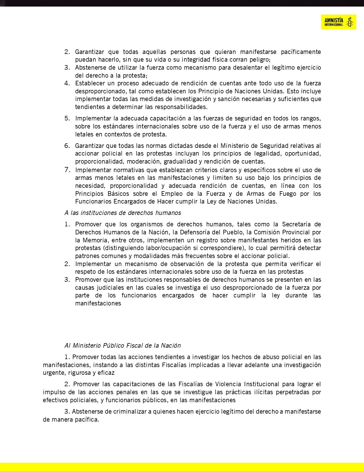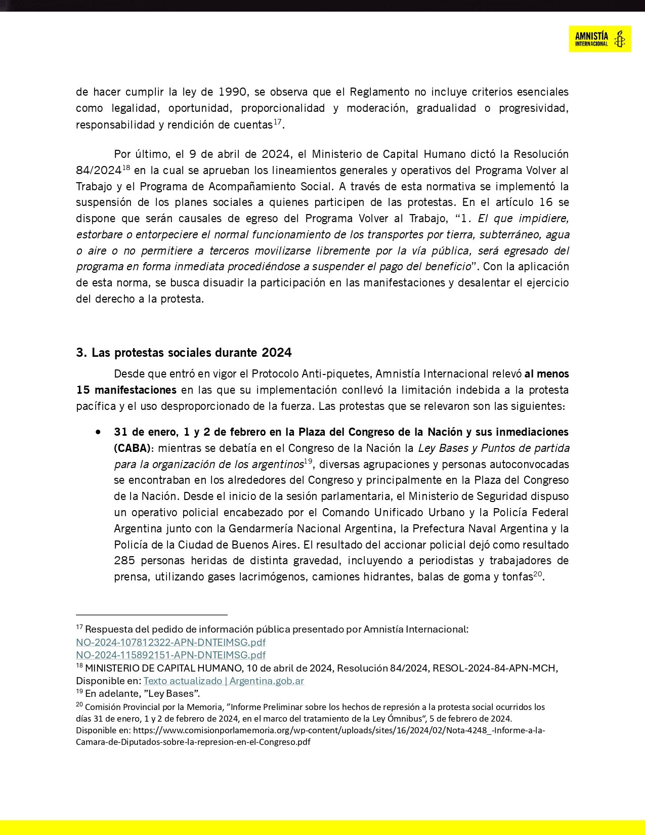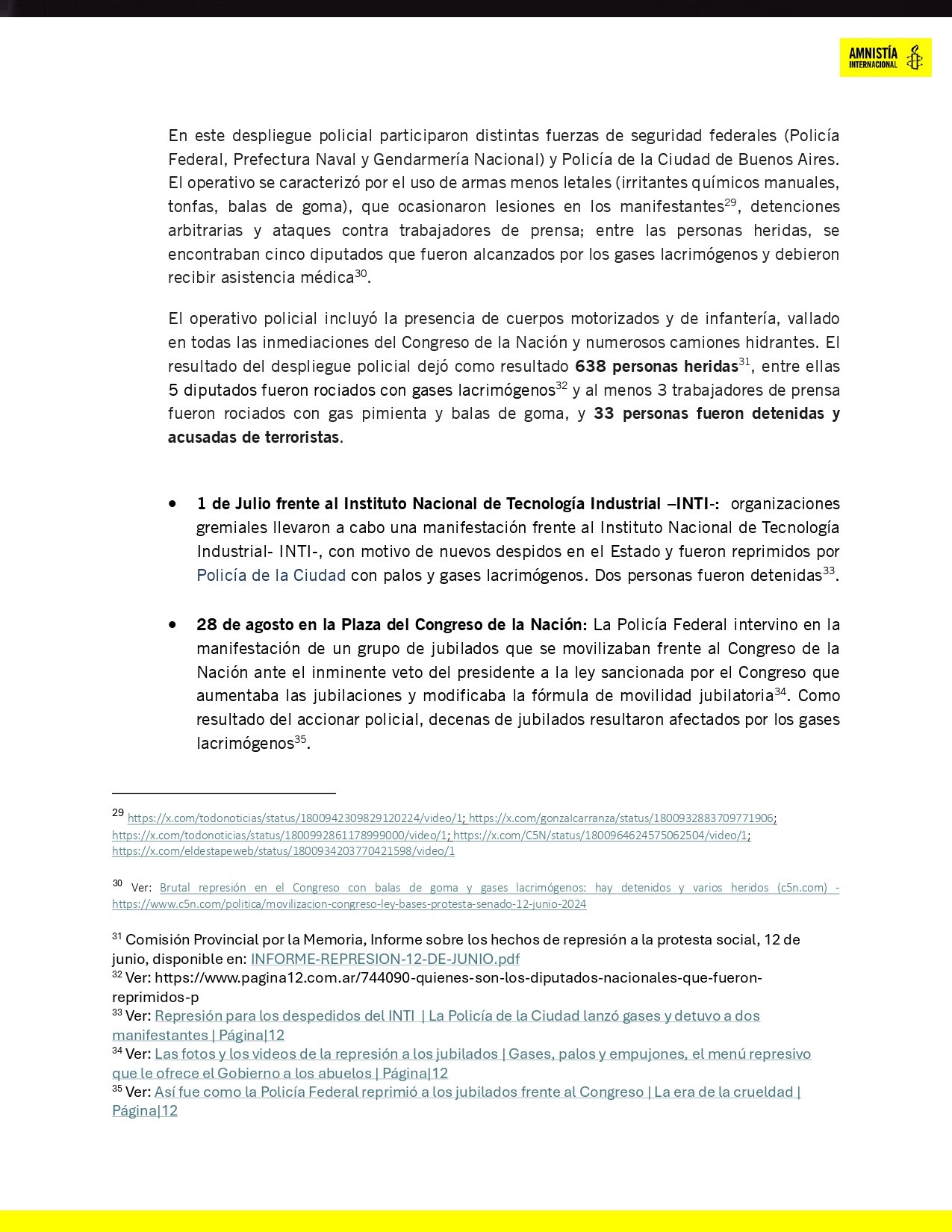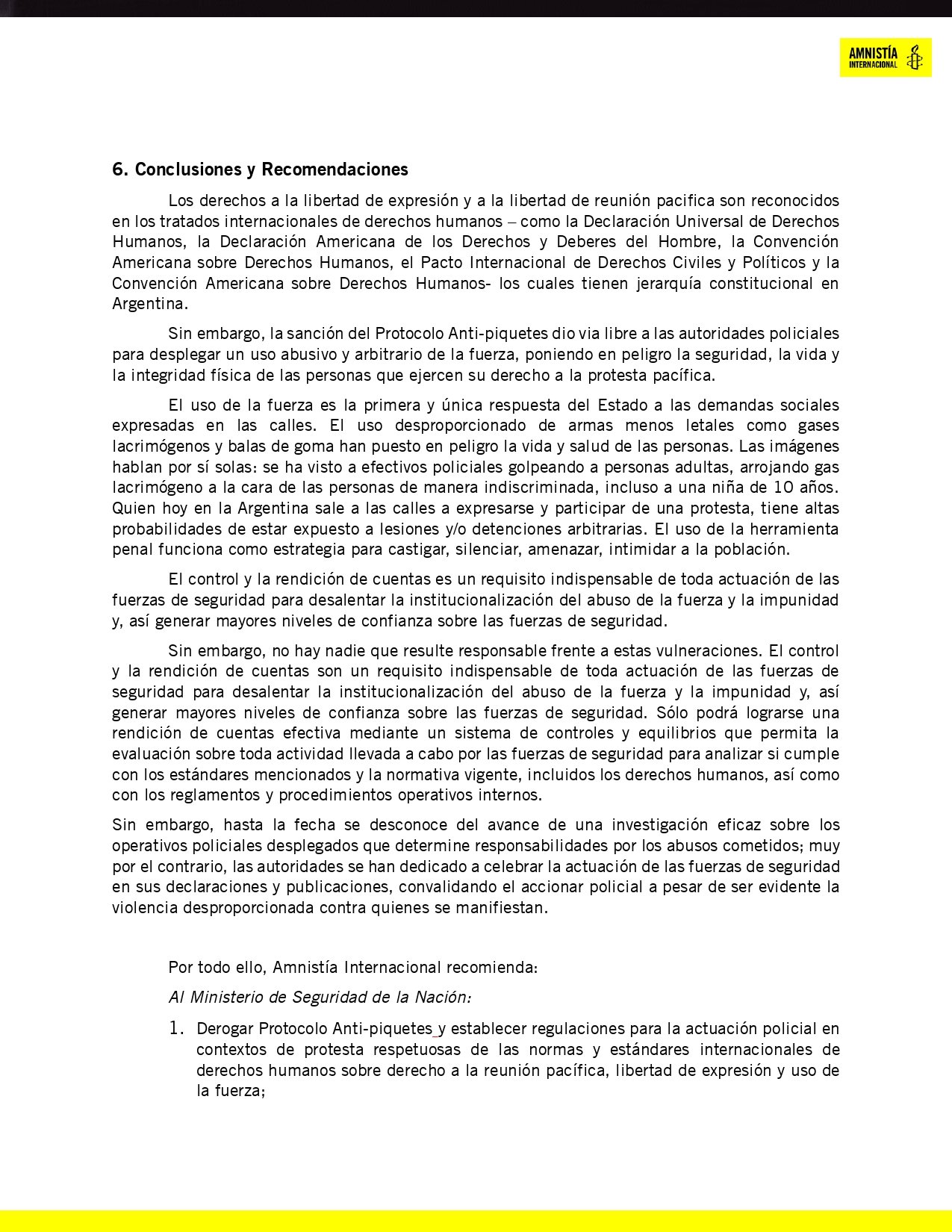 Amnistía Internacional denunció que el derecho a la protesta fue gravemente vulnerado con la implementación del protocolo. Se registraron 15 manifestaciones reprimidas, con 33 de los heridos con daños graves en el rostro, y 50 periodistas lesionados. Hay personas que perdieron la visión. “Amnistía Internacional no entiende nada”, dijo la ministra de Seguridad de Javier Milei.