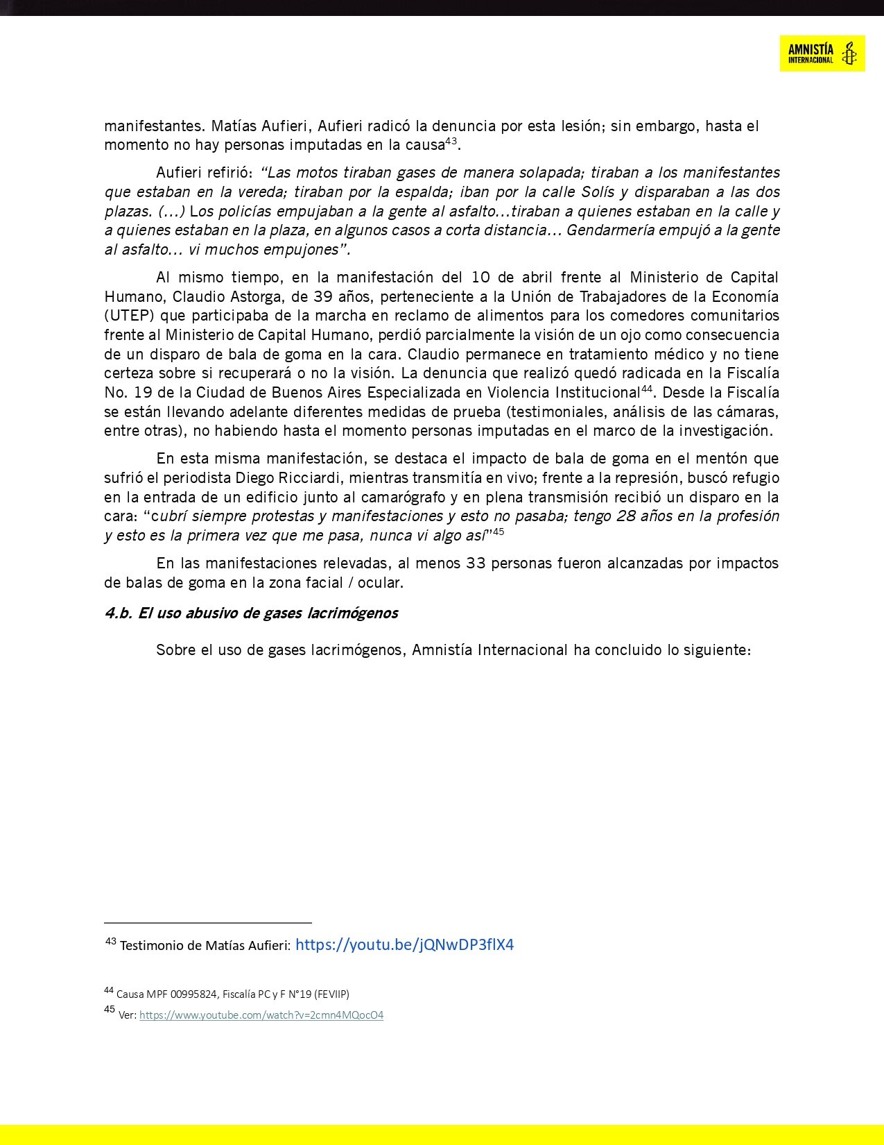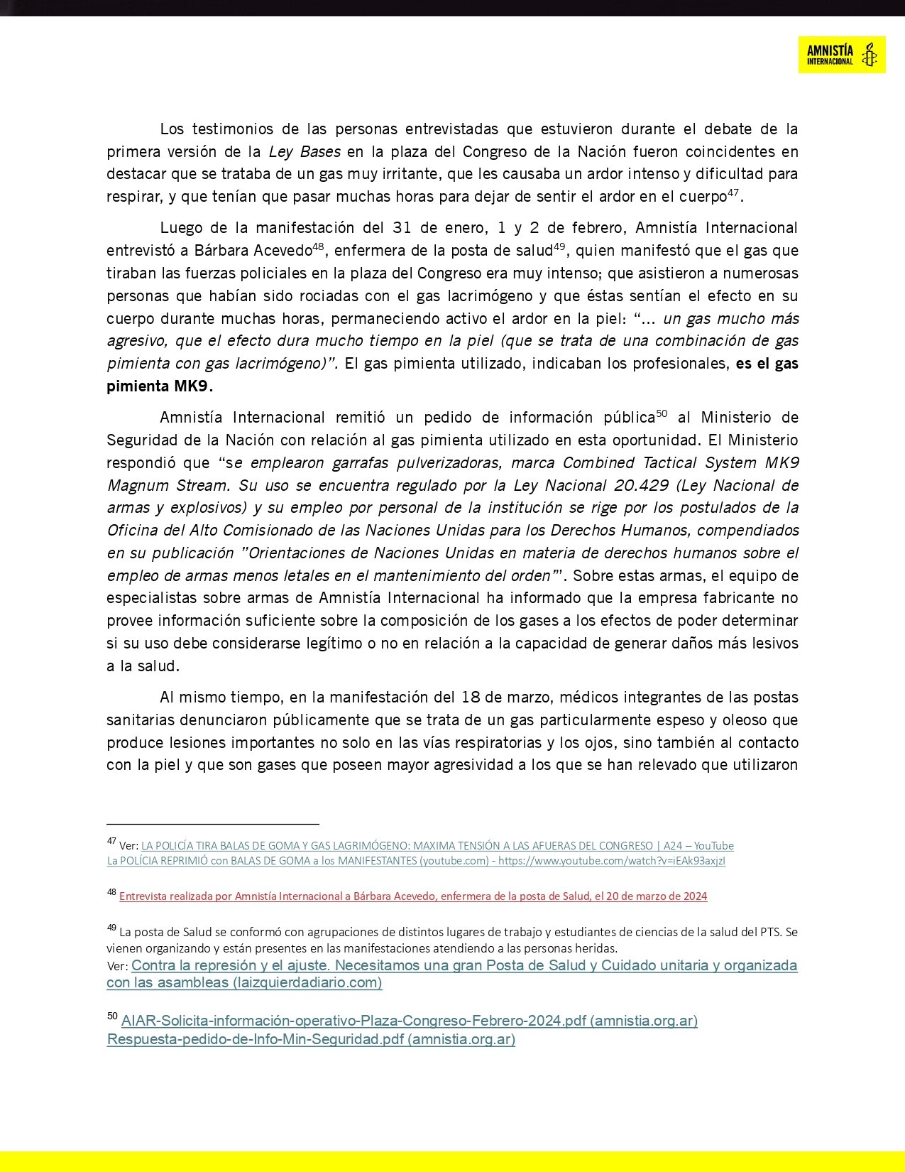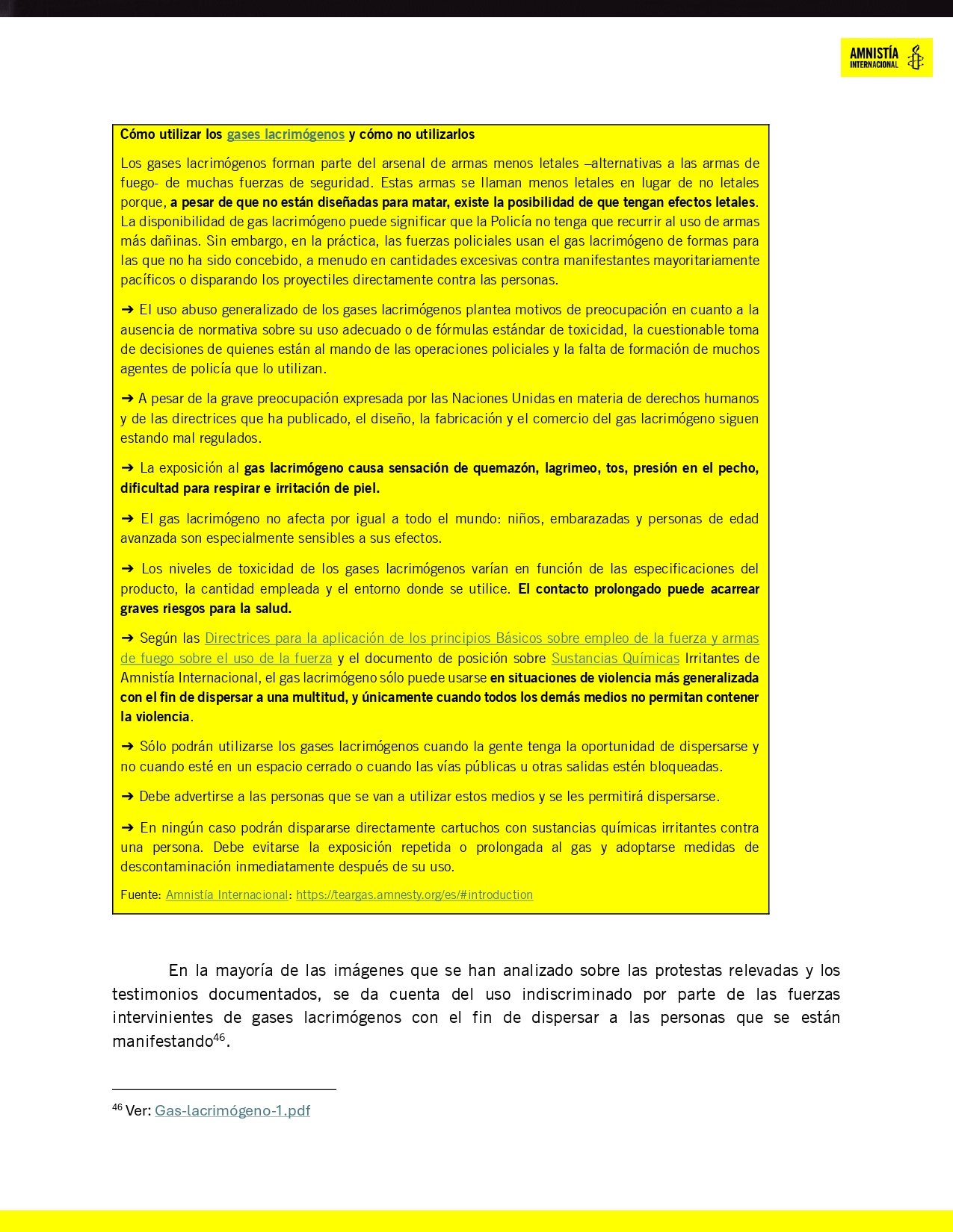 El informe de Amnistía subraya el uso desproporcionado de la fuerza como práctica sistemática. Los gases lacrimógenos, muchas veces utilizados en espacios cerrados, causaron graves afectaciones respiratorias y dermatológicas, especialmente en adultos mayores, niños y embarazadas. Testimonios documentados relatan que los efectos de estos compuestos irritantes podían durar horas, causando dolor intenso y dificultad para respirar.