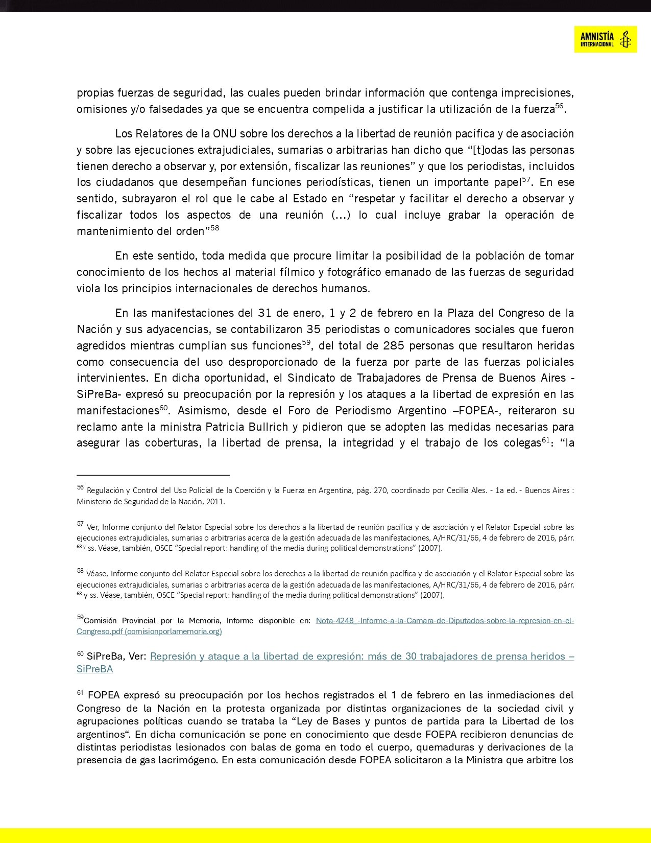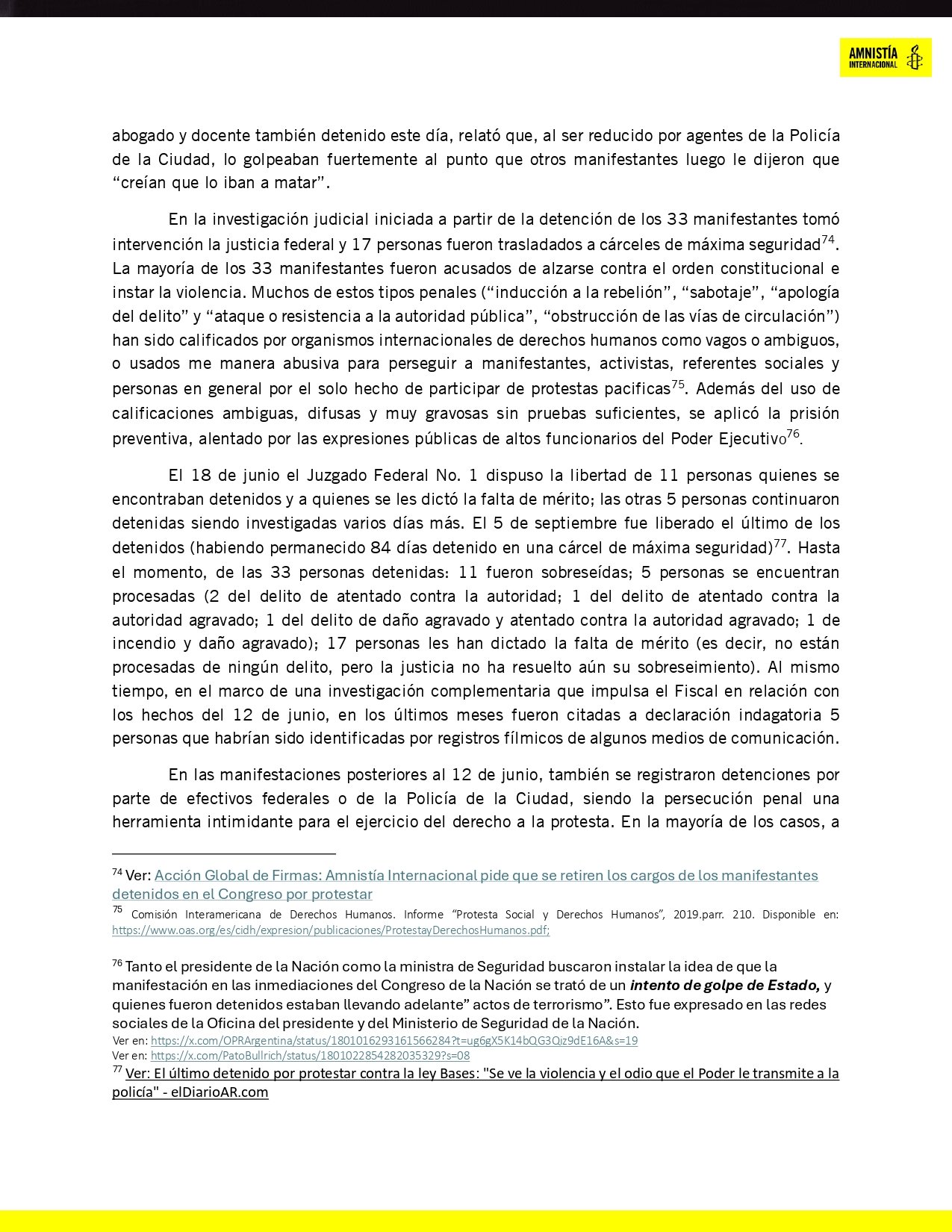 «Denunciamos la violencia policial independientemente del gobierno de turno, tal es el caso del encierro en condiciones inhumanas en centros de aislamiento, las desapariciones y asesinatos de personas por parte de las fuerzas de seguridad durante la pandemia, cuyos relevamientos e informes están disponibles en nuestra página web.» Amnistía Internacional — en respuesta a las críticas de Patricia Bullrich