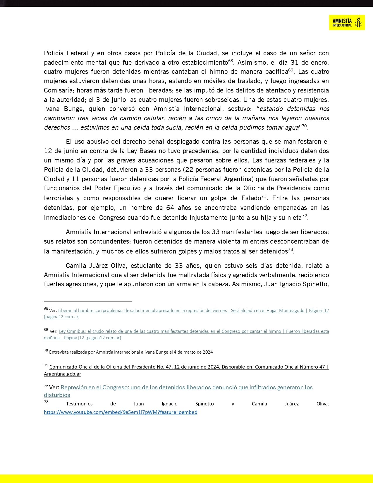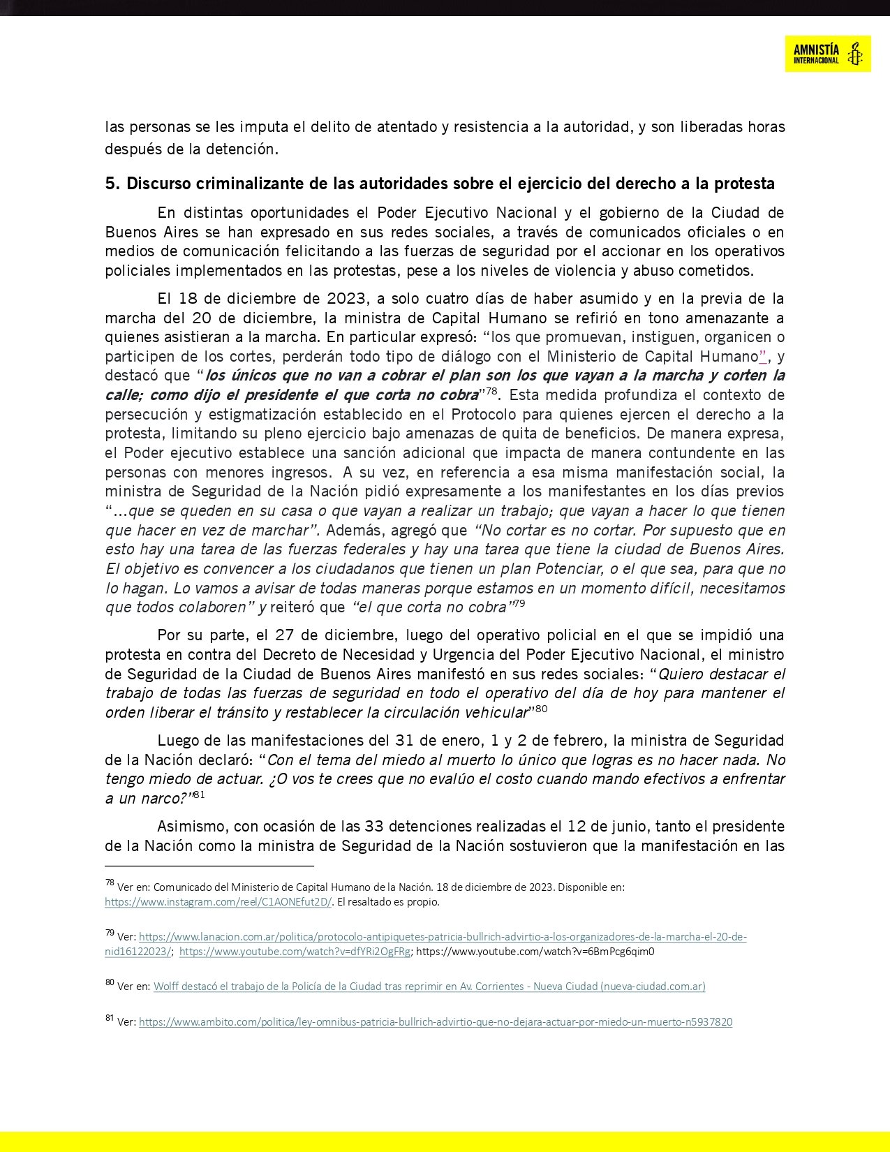 Consulta sobre la publicación de este informe, la ministra Bullrich dijo a la radio El Observador: “Amnistía Internacional no entiende nada. [Vivíamos en] un país que desde hace 25 años que tenía piquetes, que además eran con la gente extorsionada, con la gente yendo para que le den un sueldo, presos de los gerentes de la pobreza. Hemos logrado terminar con eso, con la mínima violencia. Que salgan con un informe así, la verdad es que, bueno, están del lado de los delincuentes”.