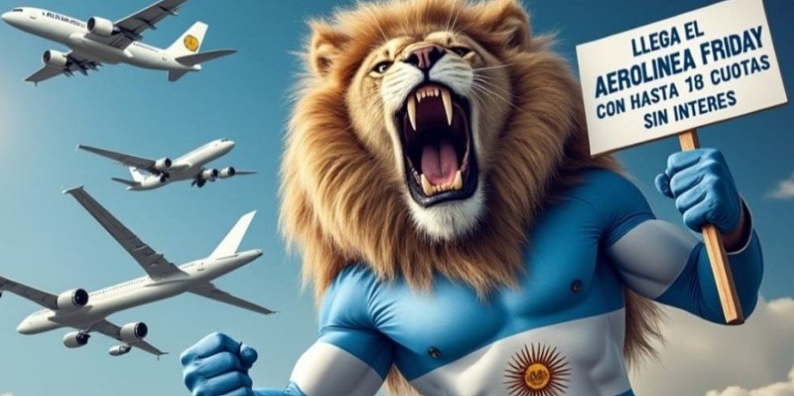 El secretario agregó un dibujito realizado con IA en el que se ve a un león gigante con el cartel de la promoción y varios aviones a su alrededor. Como la IA no es perfecta, Scioli no se dio cuenta que uno de los aviones tiene cuatro alas.