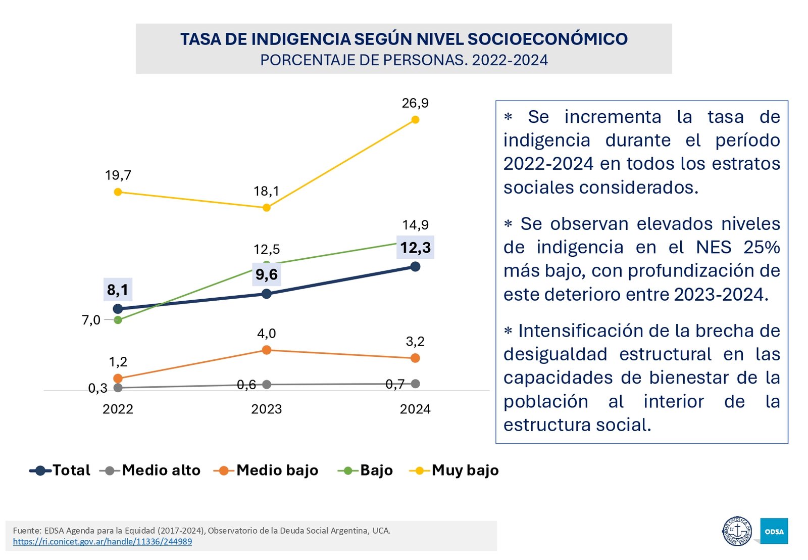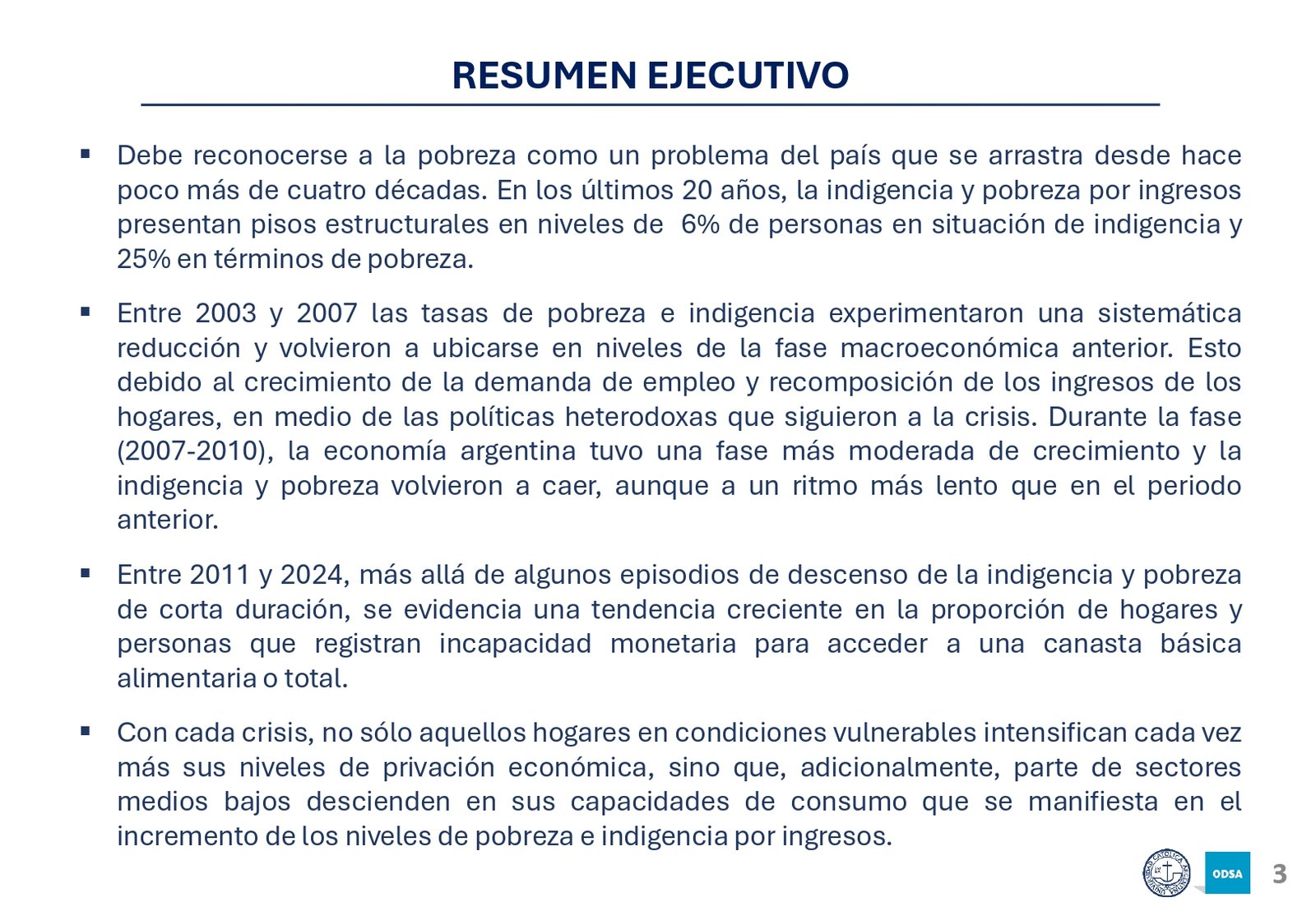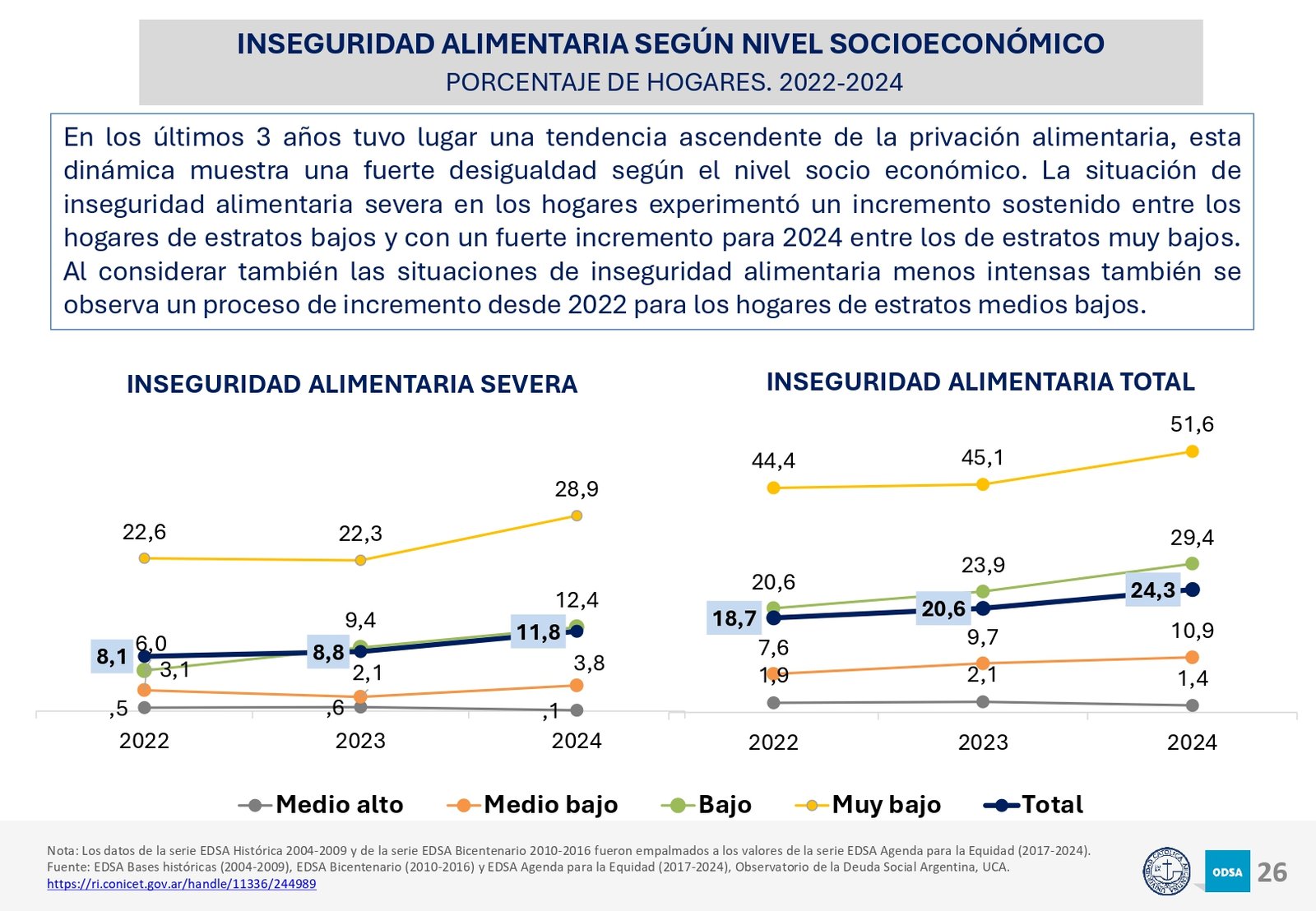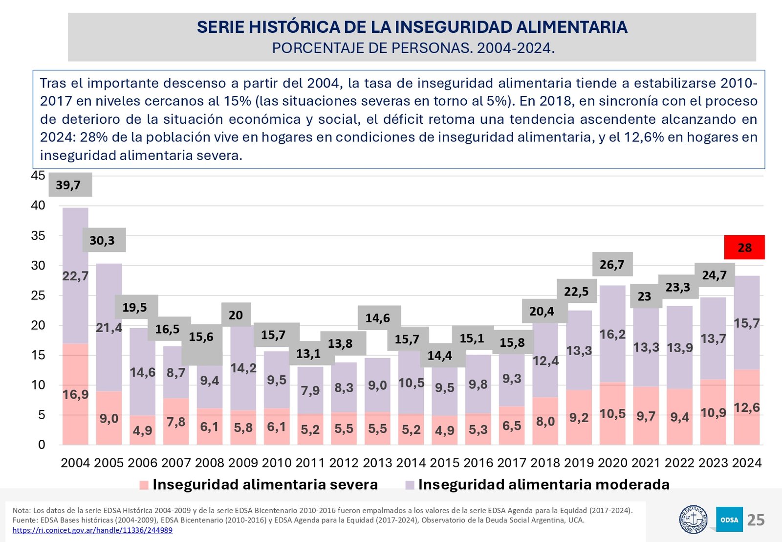 El informe del Observatorio de la Deuda Social Argentina al que accedió LPO destaca que en los últimos tres años se ha registrado un aumento en la inseguridad alimentaria, afectando principalmente a los hogares de menores ingresos. En 2024, el 28% de la población vive en condiciones de inseguridad alimentaria, y el 12,6% en situaciones de inseguridad alimentaria severa. Esta crisis se ha profundizado con el deterioro de los ingresos de los hogares, el incremento de los costos de vida y la falta de políticas públicas eficaces para mitigar sus efectos.