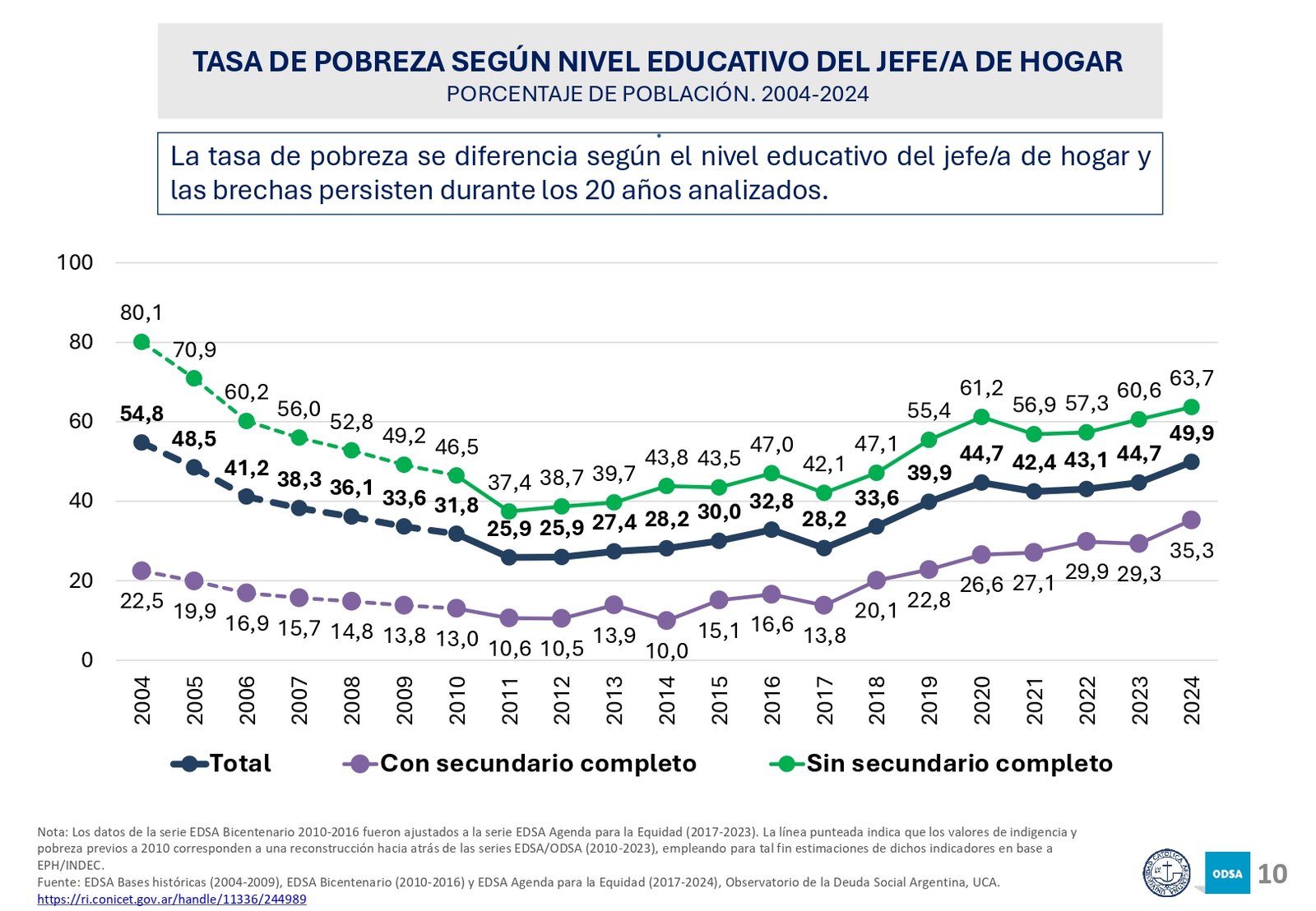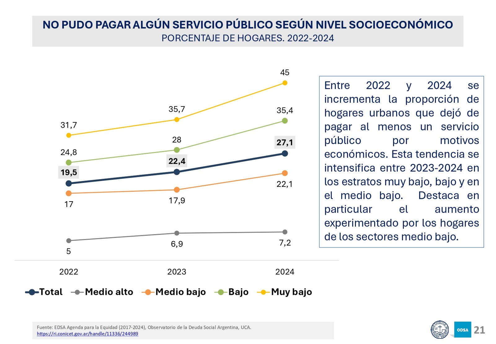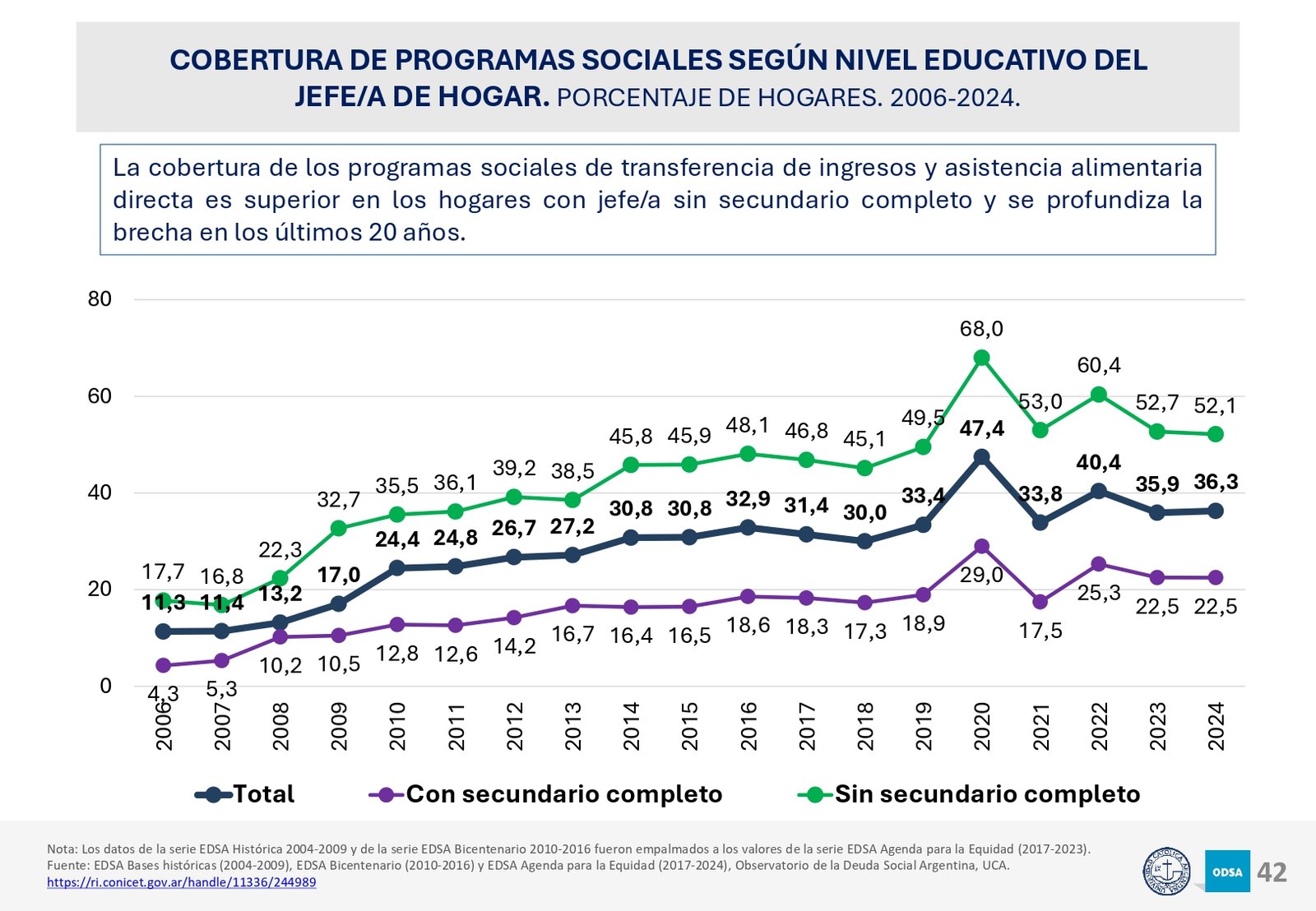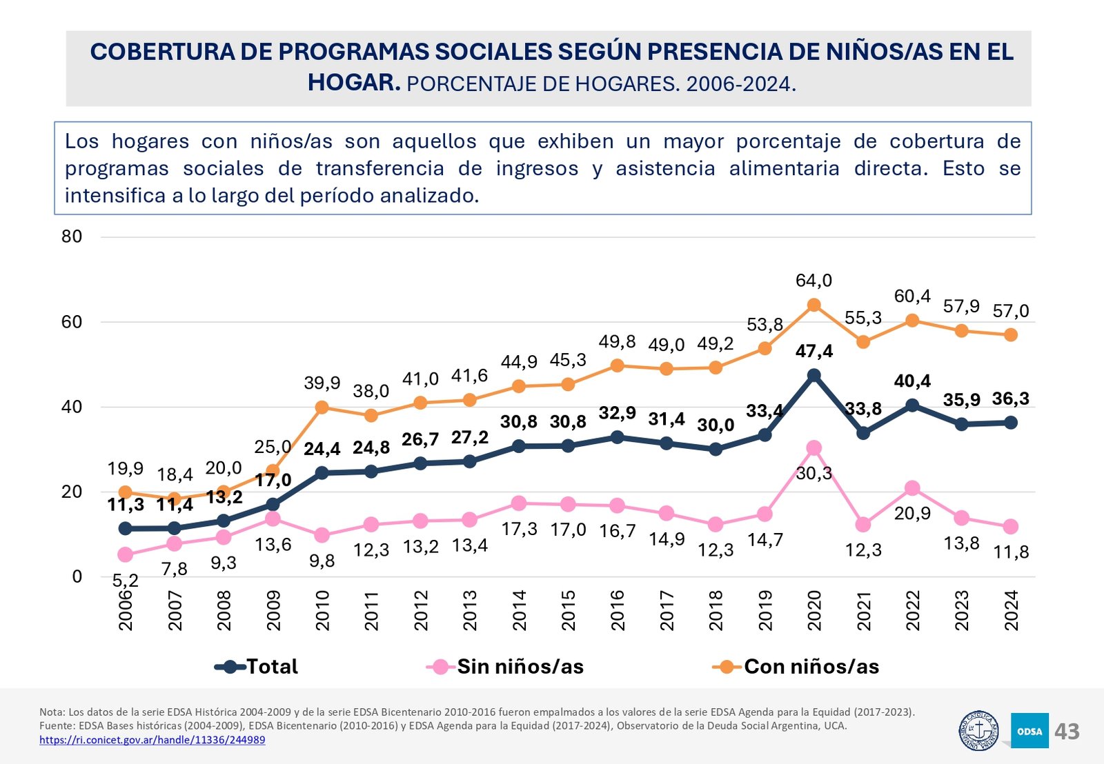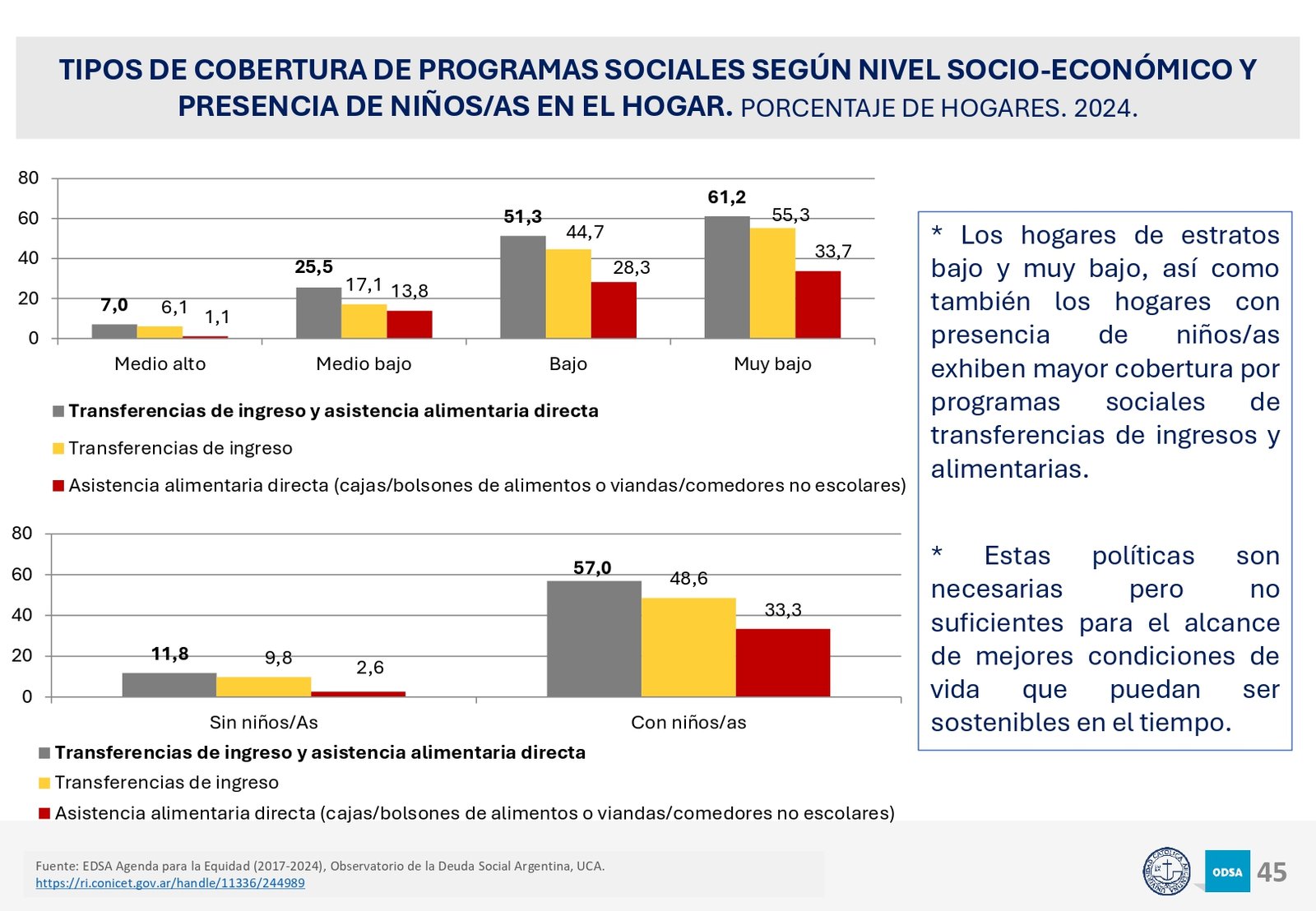 Además, el informe señala que el acceso a programas de asistencia social ha crecido en los últimos 20 años, pero la brecha entre los hogares de menores recursos y los sectores medios y altos sigue aumentando. En particular, los hogares con niños son los más afectados, con una tasa de pobreza significativamente mayor a la del resto de la población.