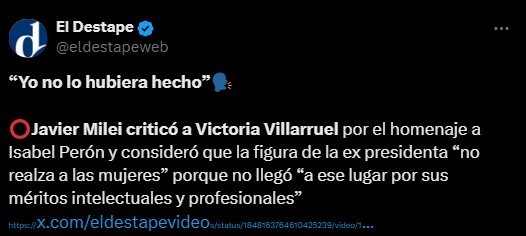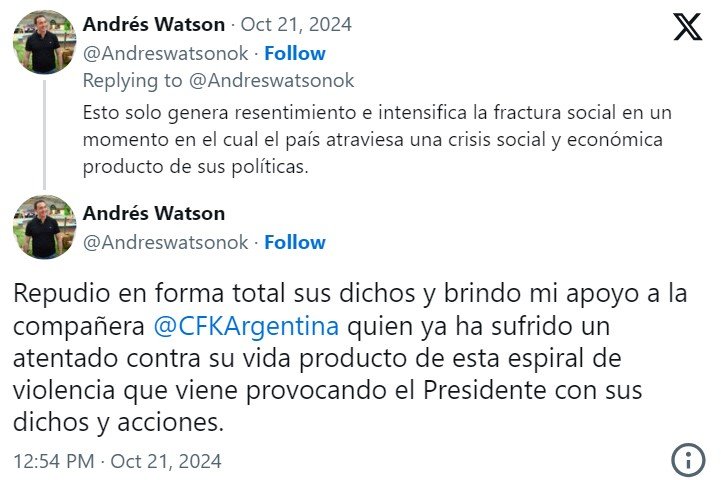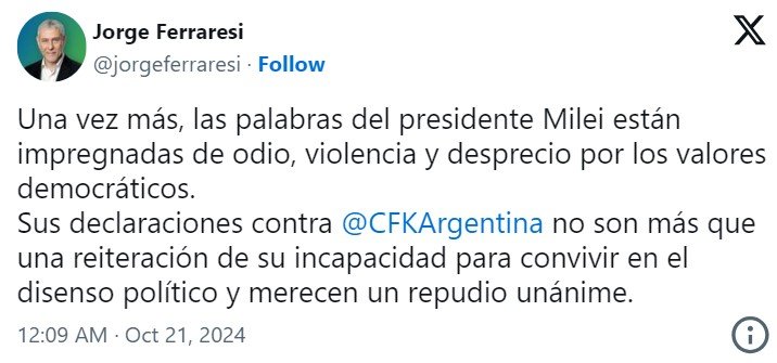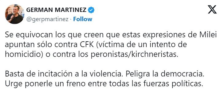 También afirma que “la mención explícita al ‘kirchnerismo’ y, en particular, a su líder, Cristina Fernández de Kirchner, evoca un deseo no solo de eliminar políticamente a una fuerza opositora y a la persona sino también de deslegitimar su rol dentro de la democracia”. Asimismo, reclama que “este tipo de expresiones no pueden ser tomadas a la ligera, ya que normalizan el discurso de odio y la intolerancia hacia quienes piensan diferente” y que se enmarcan “en el contexto del intento de magnicidio contra Cristina Fernández de Kirchner, ocurrido el 1 de septiembre de 2022” el cual “representa uno de los episodios más graves en la historia reciente de nuestro país”.