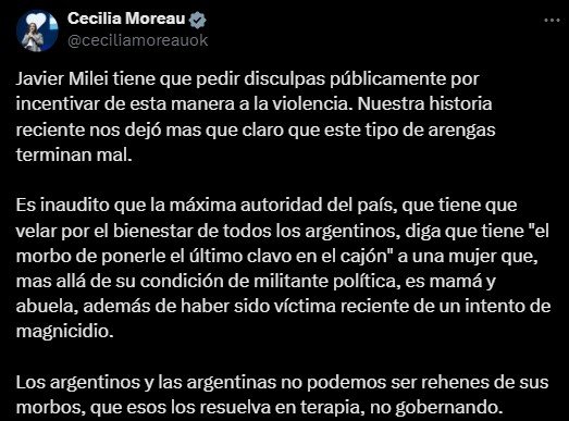 Mientras que la diputada cercana a Sergio Massa le exigió a Milei que pida disculpas por “incentivar a la violencia” y consideró que “los argentinos y las argentinas no podemos ser rehenes de sus morbos, que esos los resuelva en terapia, no gobernando”.