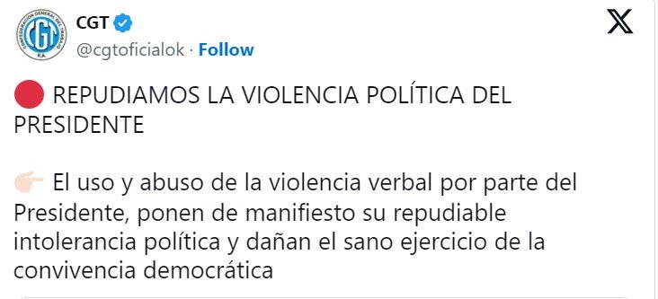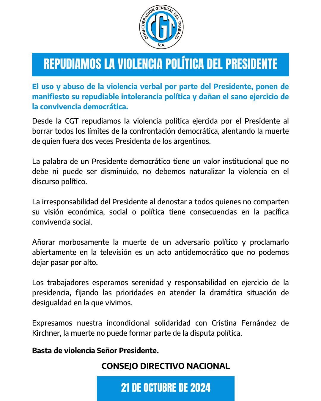 Otra de las manifestaciones provino de la Confederación General del Trabajo (CGT), que repudió las expresiones del Presidente y lo acusaron de «borrar todos los límites de la confrontación democrática» al alentar la muerte de la ex Presidenta. «La irresponsabilidad del Presidente al denostar a todos quienes no comparten su visión económica, social o política tiene consecuencias en la pacífica convivencia social». Así, llamaron a la «serenidad y responsabilidad» y le reclamaron que «atienda la dramática situación de desigualdad» que atraviesa el país.