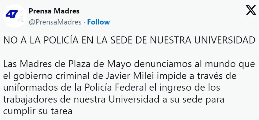 «Las madres de Plaza de Mayo denunciamos al mundo que el gobierno criminal de Javier Milei impide a través de uniformados de la Policía Federal el ingreso a trabajadores de nuestra Universidad a su sede, para cumplir su tarea», decía el comunicado que Madres de Plaza de Mayo publicó en las redes sociales cuando la fuerza cercaba la sede universitaria.