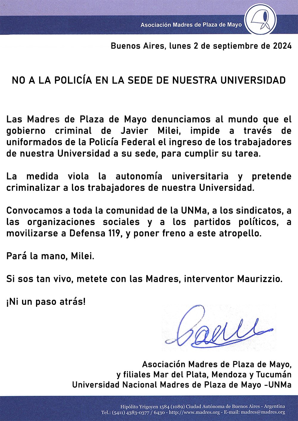 Y concluía, en un mensaje al presidente ultraderechista y al interventor que puso el Gobierno nacional frente a la sede a fines de julio, Eduardo Luis Maurizzio : «Pará la mano, Milei. Si sos tan vivo, metete con las Madres, interventor Maurizzio. ¡Ni un paso atrás!».