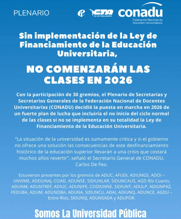 “Sin implementación de la Ley de Financiamiento de la Educación Universitaria, no comenzarán las clases en 2026”.