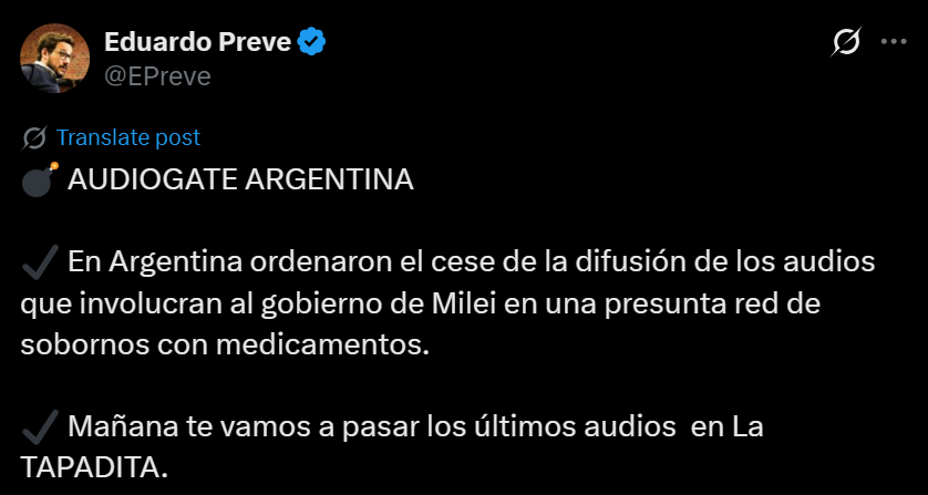 El anuncio se realizó a través de las redes sociales de la radio uruguaya M24, donde se promocionó la emisión de mañana del programa «La Tapadita» de Preve. «AUDIOGATE ARGENTINA. En Argentina ordenaron el cese de la difusión de los audios que involucran al gobierno de Milei en una presunta red de sobornos con medicamentos. Mañana te vamos a pasar los últimos audios», reza la publicación.