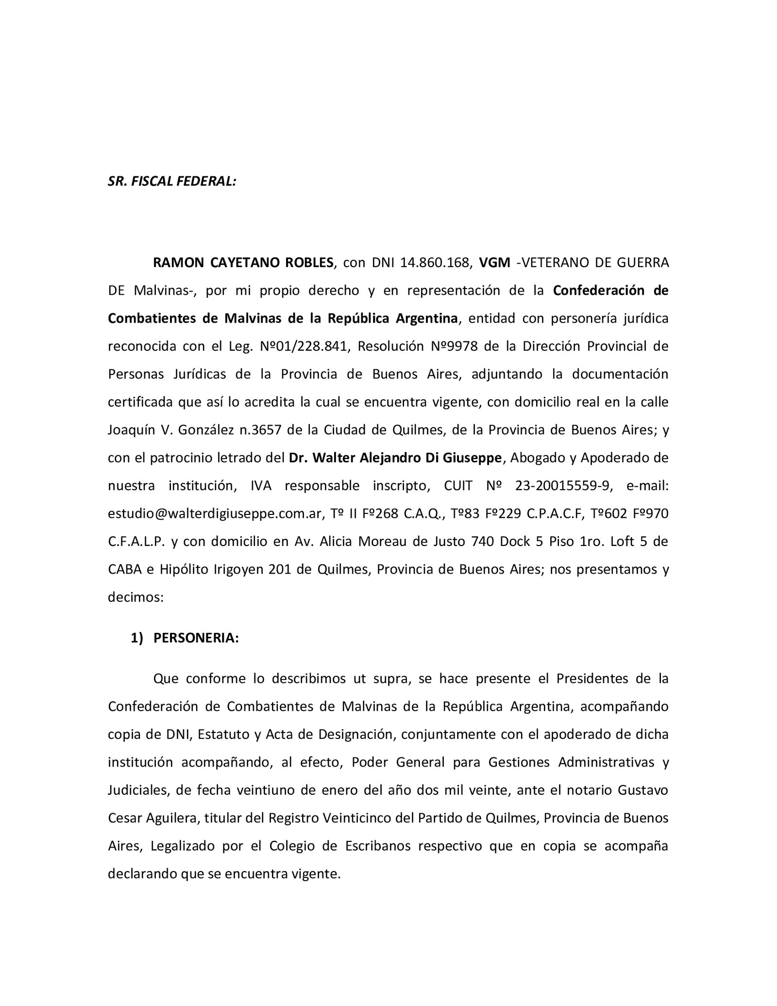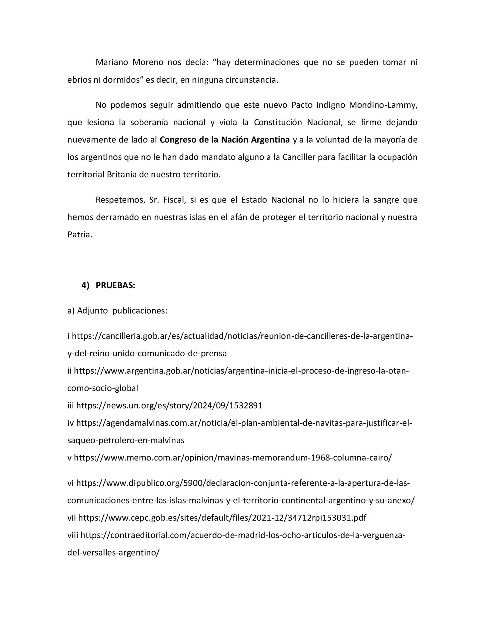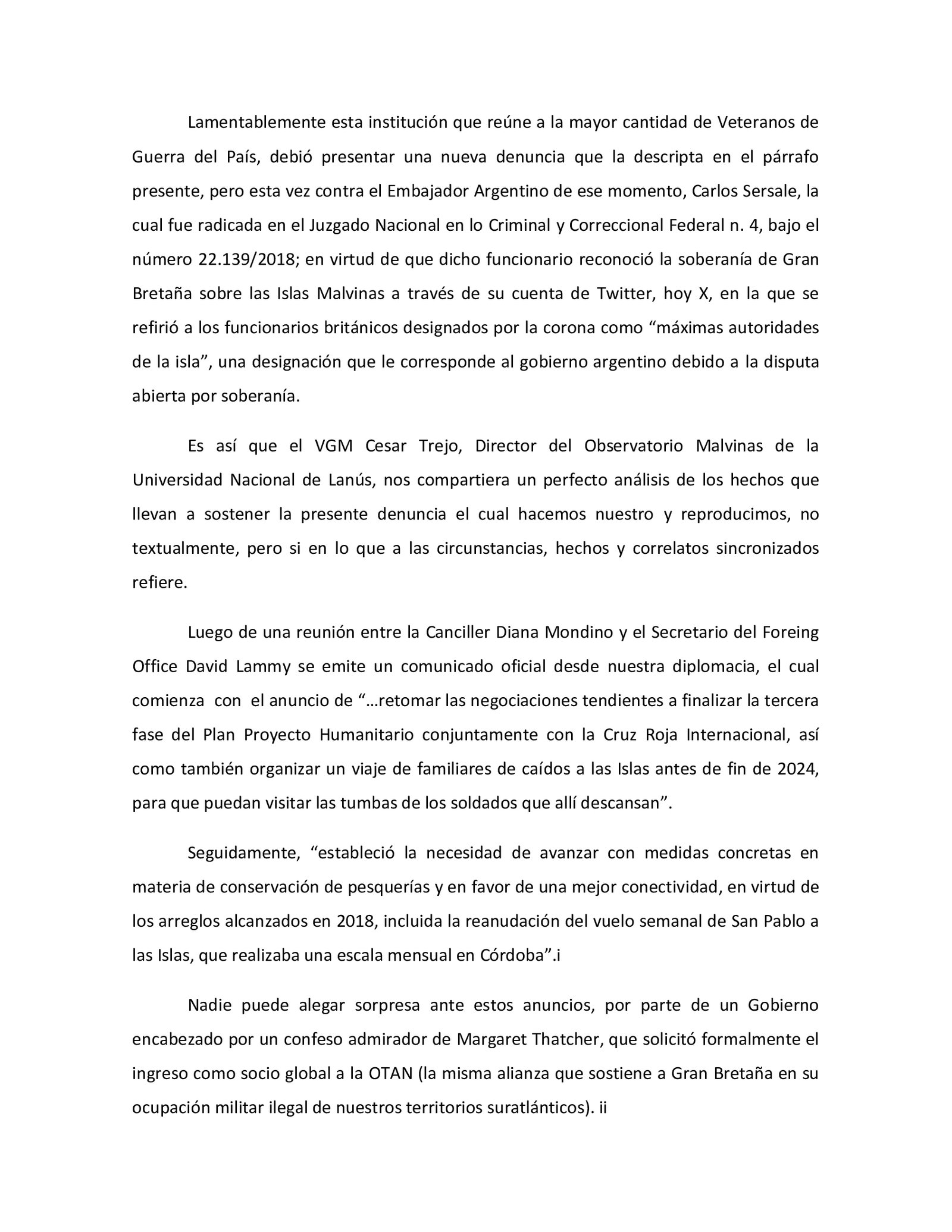 La presentación la firma el veterano Ramón Cayetano Robles de la Confederación de Veteranos que detalles que es «por hechos que «prima facie » podrían constituir los delitos de Violación de los Deberes de Funcionario Público, Abuso de Autoridad y Traición a la Patria; conforme arts. 248 y ss. y 214 ss. y concordantes del Código Penal».