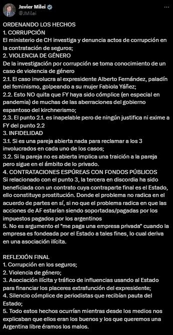 «Esto NO quita que Fabiola Yáñez haya sido cómplice (en especial en pandemia) de muchas de las aberraciones del gobierno espantoso del kirchnerismo; 2.3. El punto 2.1. es inapelable pero de ningún justifica ni exime a FY del punto 2.2», sostuvo Milei.