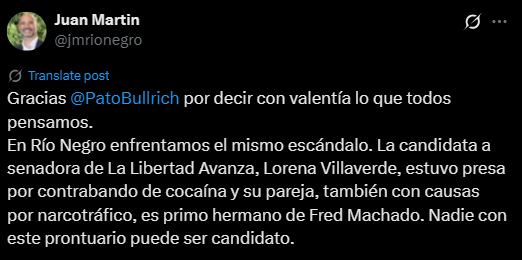 Semejante currículum fue el argumento para que en agosto el PRO rionegrino rompiera la Alianza La Libertad Avanza y presentara boletas propias para las legislativas. El partido de Mauricio Macri, dirigido en la provincia por Juan Martín, dijo que acordaba con Milei pero que no se iban “a juntar con delincuentes, vagos ni paracaidistas”. “Ese acuerdo se cayó porque quieren que seamos actores de reparto en una lista con lo peor de la política”, denunciaron. Martín enfocó directo a Villaverde, habló de un “circo romano” con los “Villaverdes de la vida”. Y le pidió a Miei “que se libre de los impresentables, de los que tienen que dar explicaciones por causas judiciales que están en boca de todos”.