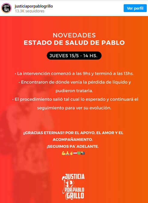 “¡Gracias eternas! Por el apoyo, el amor y el acompañamiento. ¡Seguimos pa´adelante!”, contó la contaron desde Justicia por Pablo Grillo, la cuenta de redes sociales que va actualizando el estado de salud del fotógrafo. Desde el lunes, habían informado que esta situación posponía el alta y el posterior traslado al centro de rehabilitación.