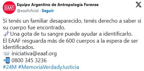 Mientras tanto, el EAAF sigue desarrollando innovaciones para poder avanzar en la memoria, la verdad y la justicia. Es el caso de “La Búsqueda”, un micrositio de visualización de datos que recorre más de 40 años de trabajo del Equipo Argentino de Antropología Forense en la identificación y restitución de personas desaparecidas.