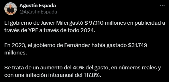 Los números son contundentes. En 2024, YPF gastó $97.110 millones en publicidad, un 39,9% más que en el último año del gobierno de Alberto Fernández. Solo en el primer semestre de gestión libertaria, la cifra trepó a $33.000 millones. La cifra fue revelada por el investigador del Conicet Agustín Espada, quien analizó los balances oficiales y advirtió que ese dinero se convirtió en la nueva “caja” del gobierno de Milei para financiar medios afines, una vez cortada la pauta directa desde la Jefatura de Gabinete. “Es un monto muy alto que, en buena medida, reemplaza lo que Milei recortó en gasto publicitario del gobierno central”, explicó. Espada también cuestionó la falta total de transparencia: no hay datos públicos sobre qué medios, periodistas o productoras cobraron esos fondos.